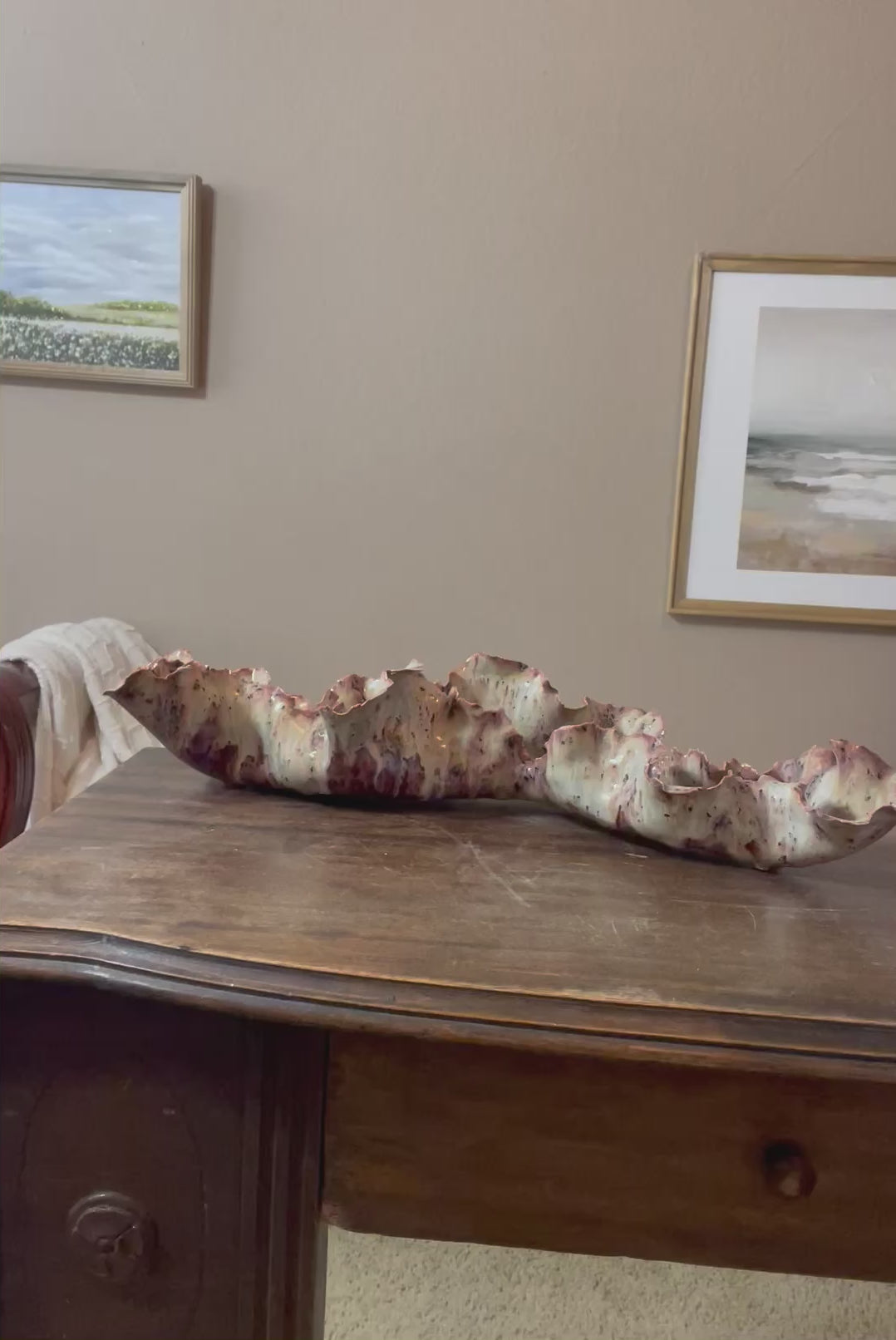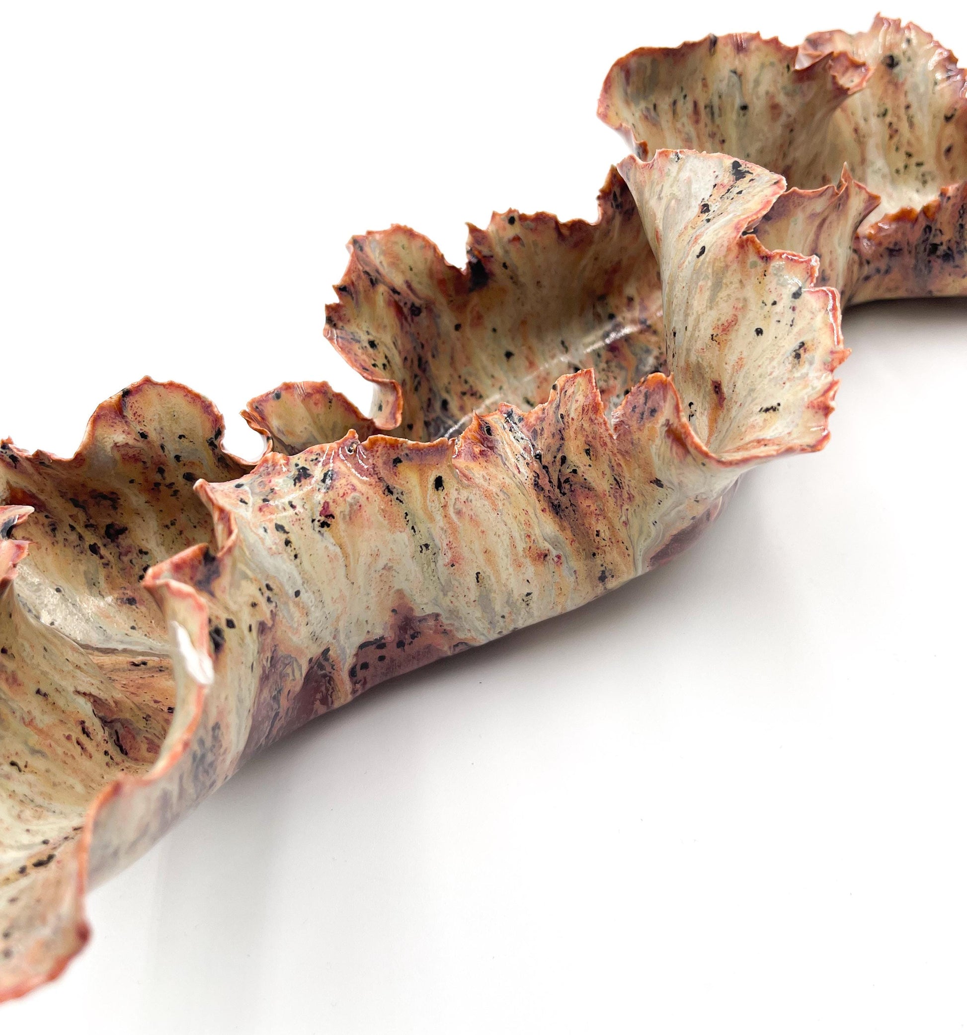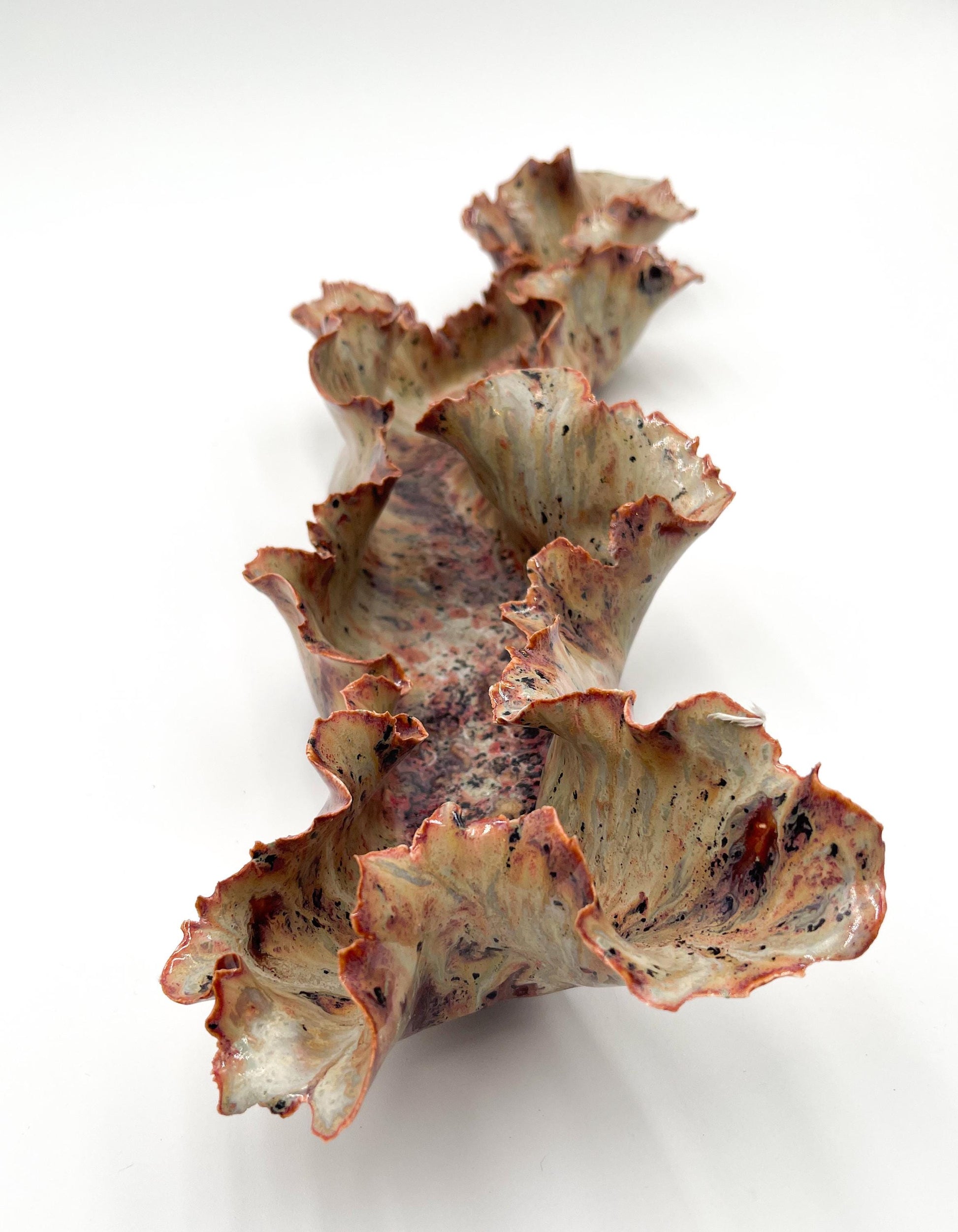 After experimenting with stoneware and porcelain clay to try and create either a flower sculpture or coral sculpture, Cori created a piece that looks like Fox Coral. An original unique piece perfect for your home decor.