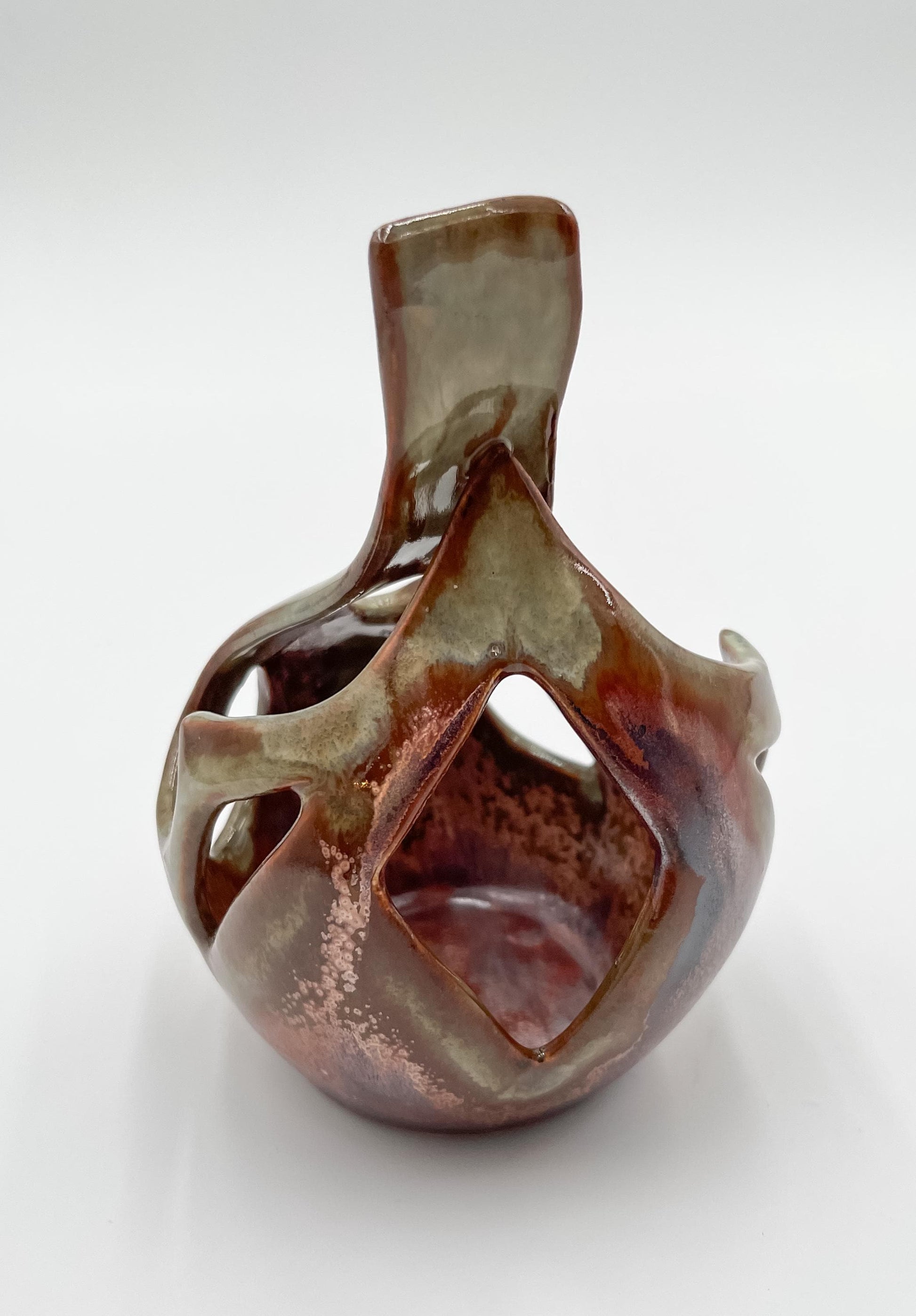 Bring a touch of warmth and contemporary design to your space with this one-of-a-kind, hand-built porcelain sculpture. Measuring 5” x 5” wide and 6” tall, this piece showcases rich brown, orange, and bronze tones that shift beautifully in the light.