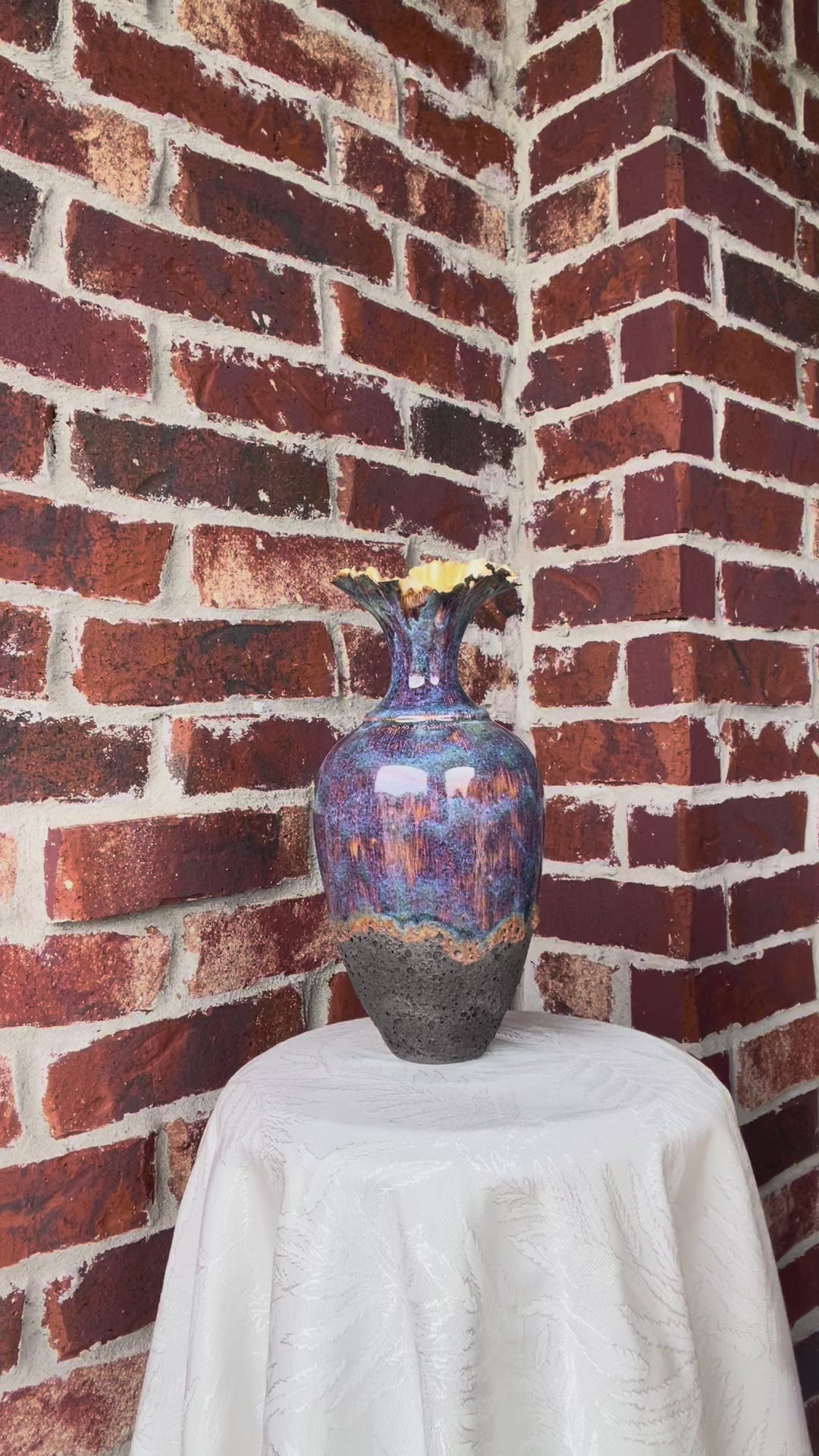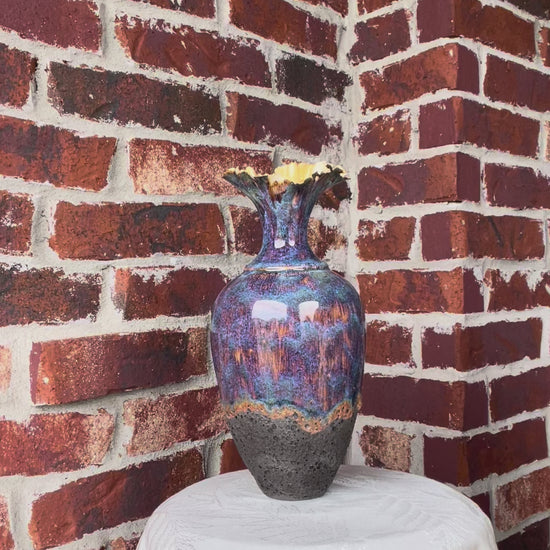 Layered glazes in natural stone tones of soft blue, mossy green and earthy browns give the vessel a river rock finish that feels organic and enduring. The contoured porcelain clay creates an elegant silhouette, while the textured glaze invites touch and adds depth.