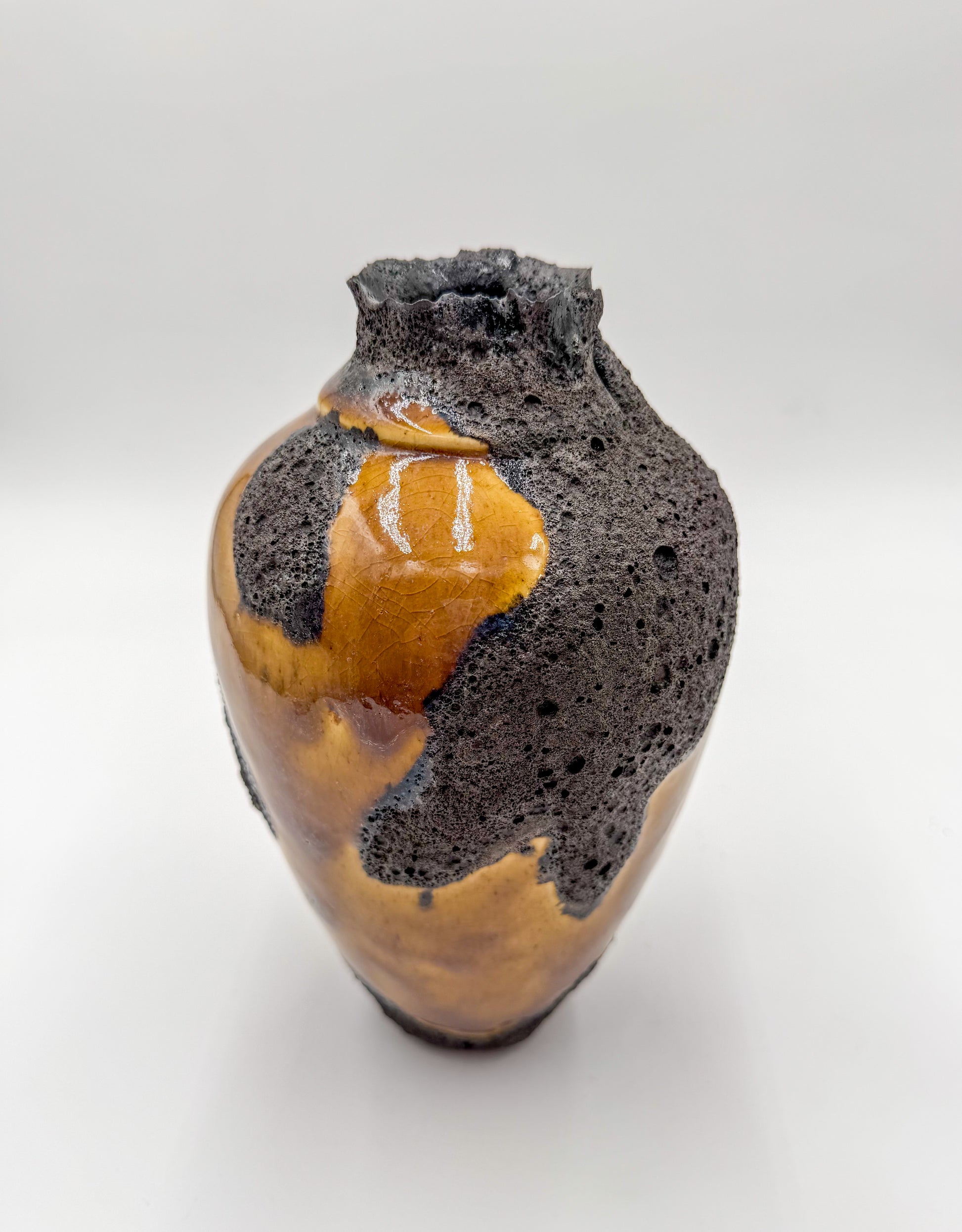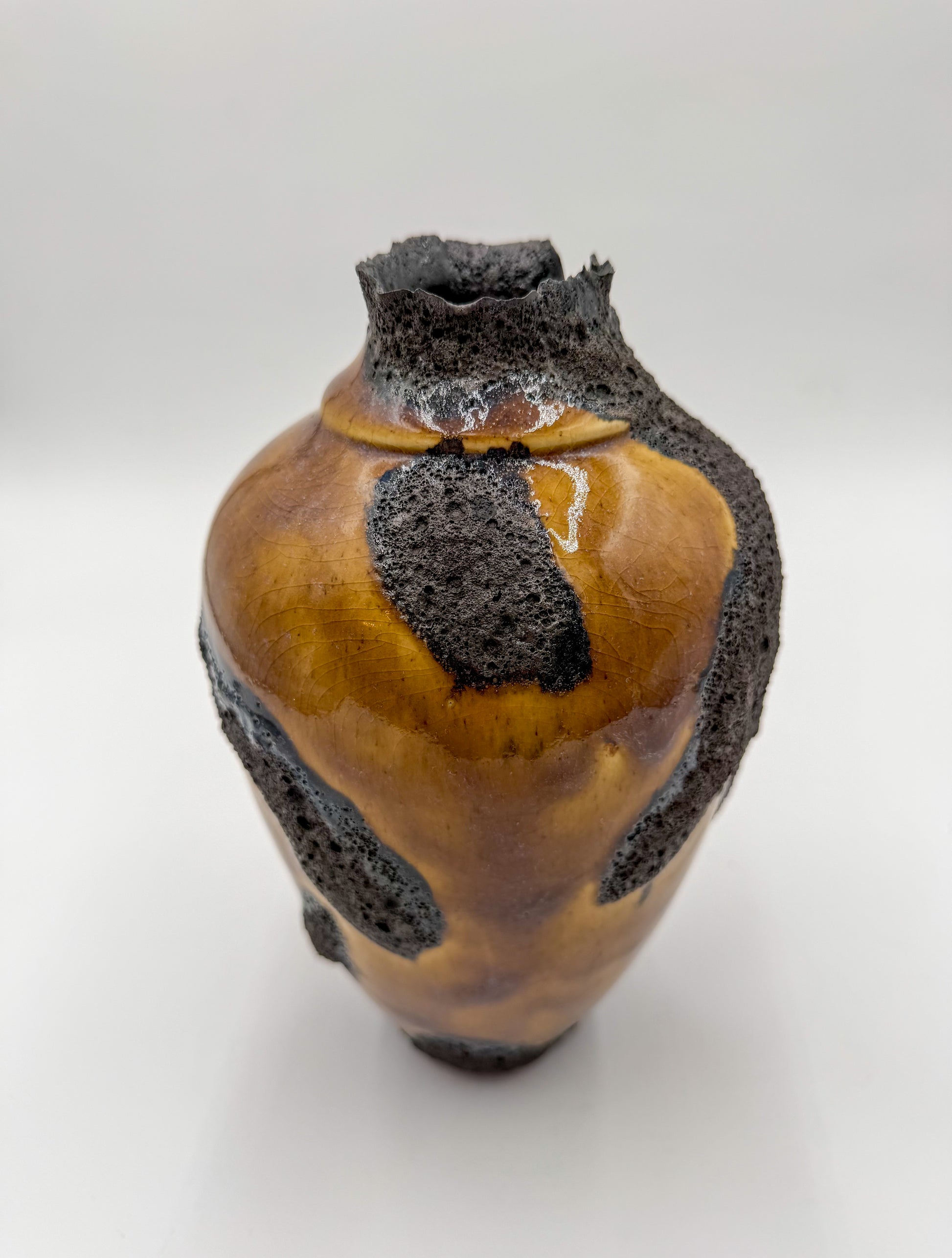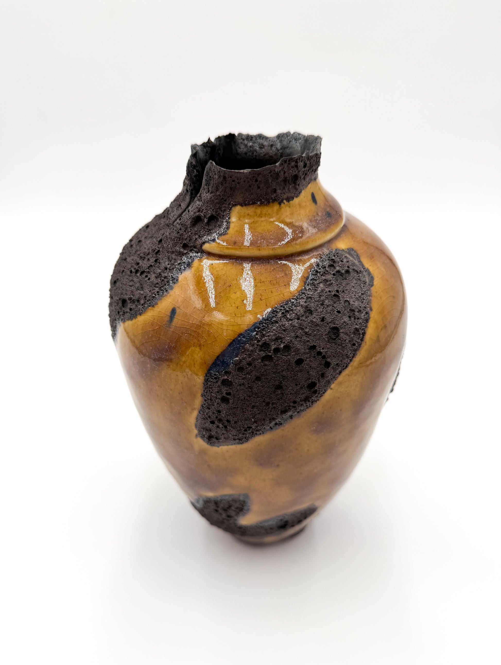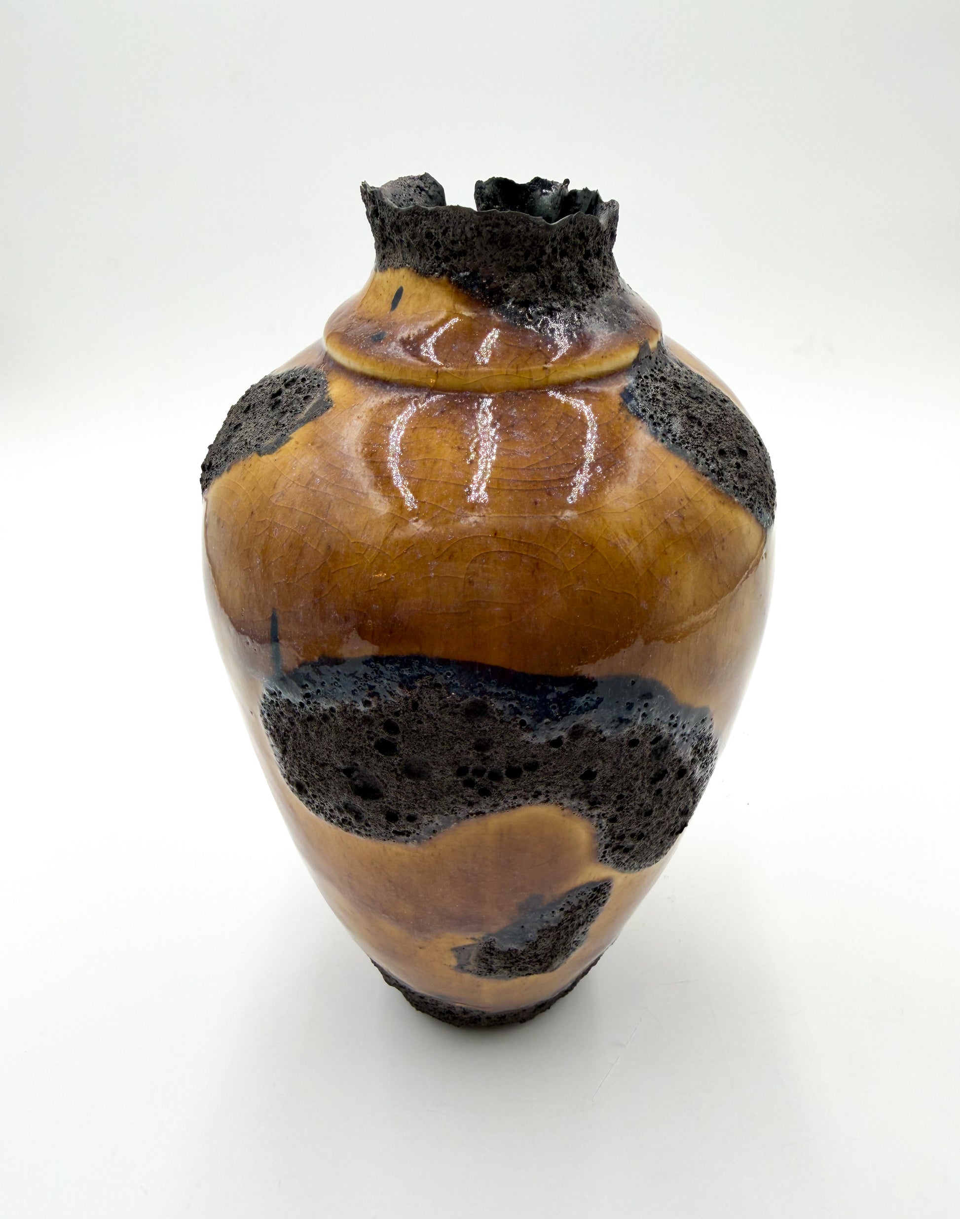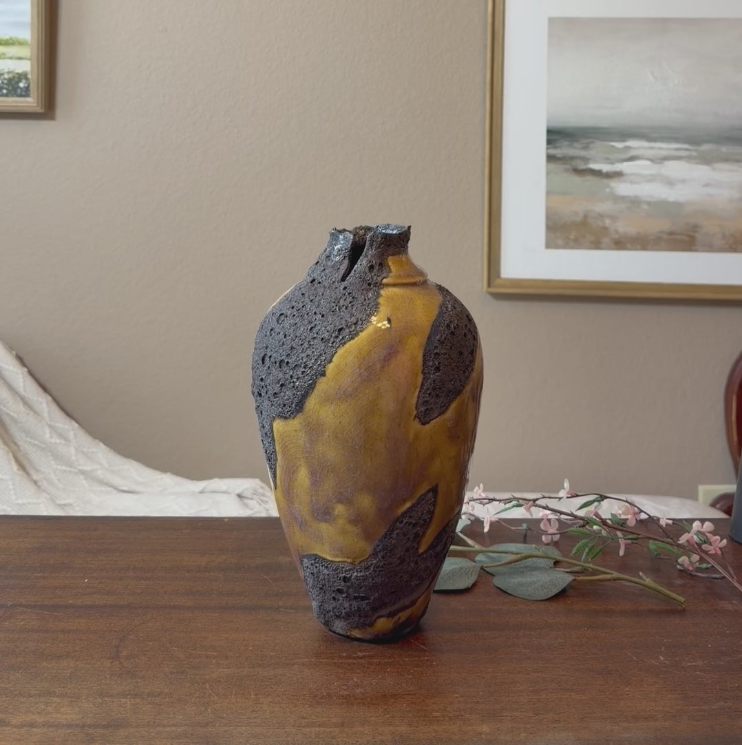 This large vessel is finished in a rich mustard-brown glaze, alive with bold black magma blooms that rise and spread organically across the surface. The dramatic spotting forms naturally in the kiln, creating depth, movement, and a landscape-like texture that can never be replicated.