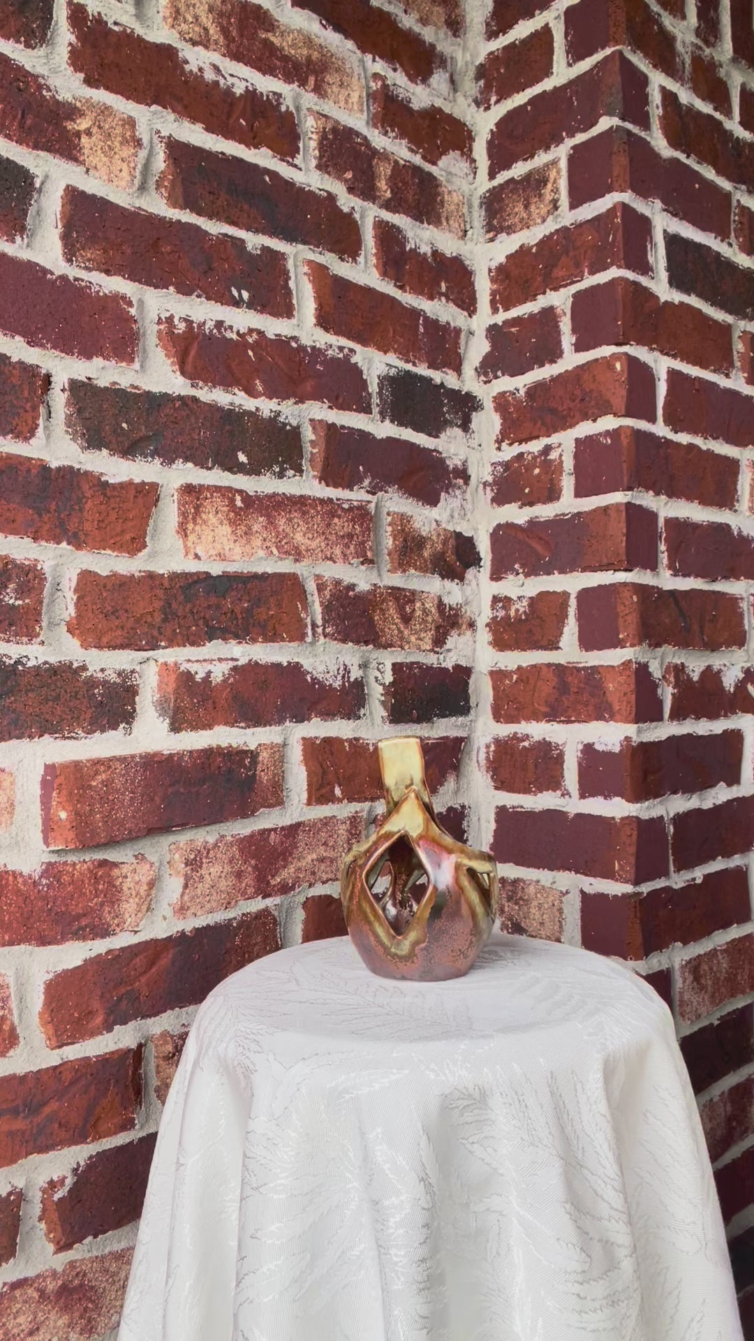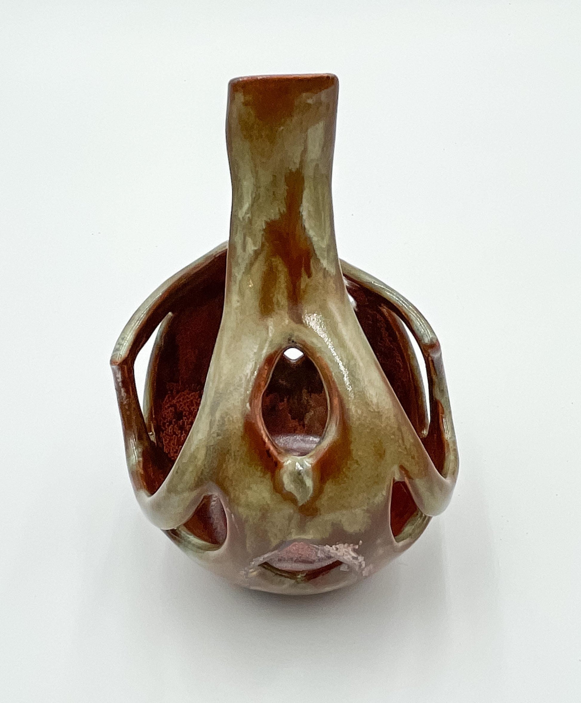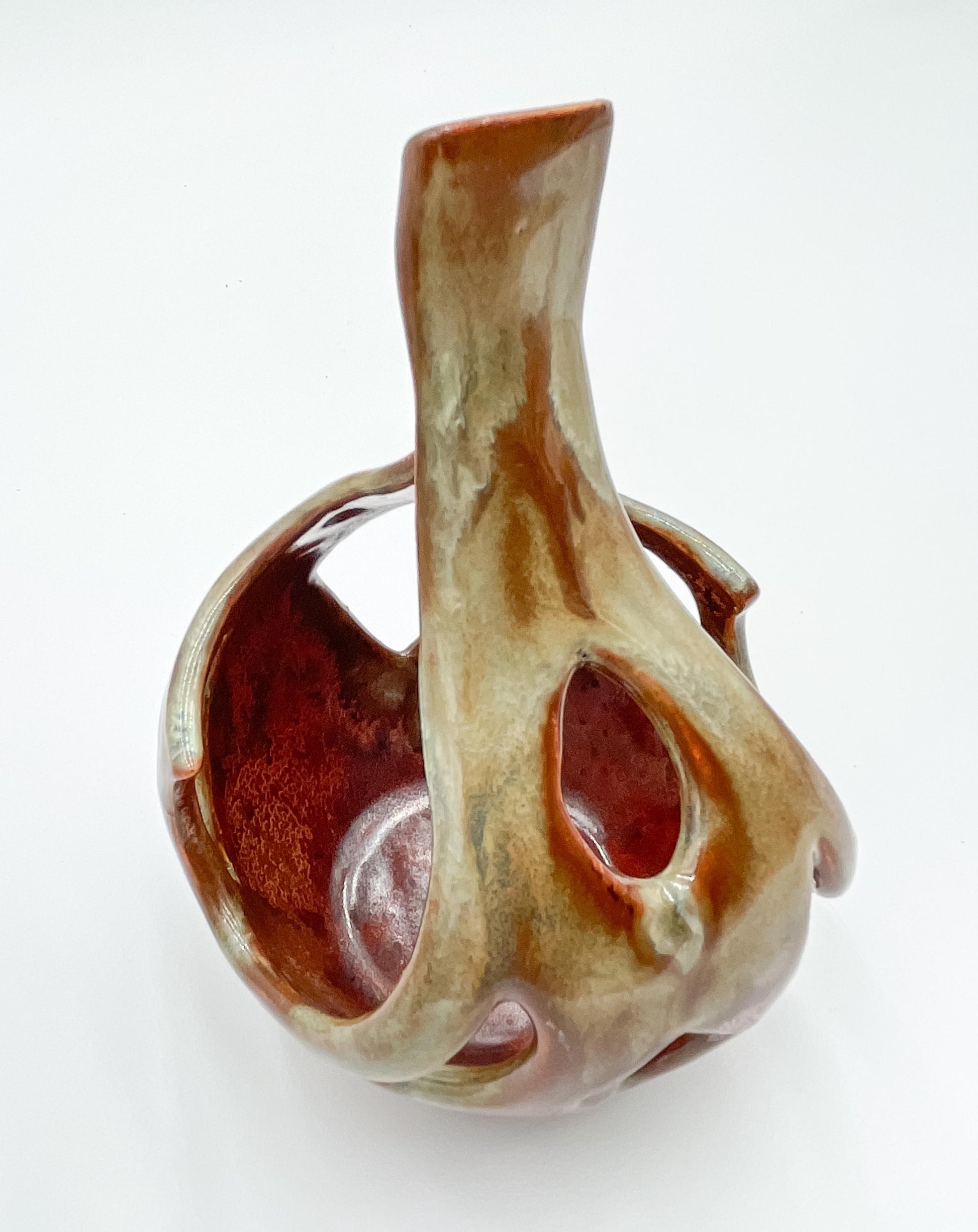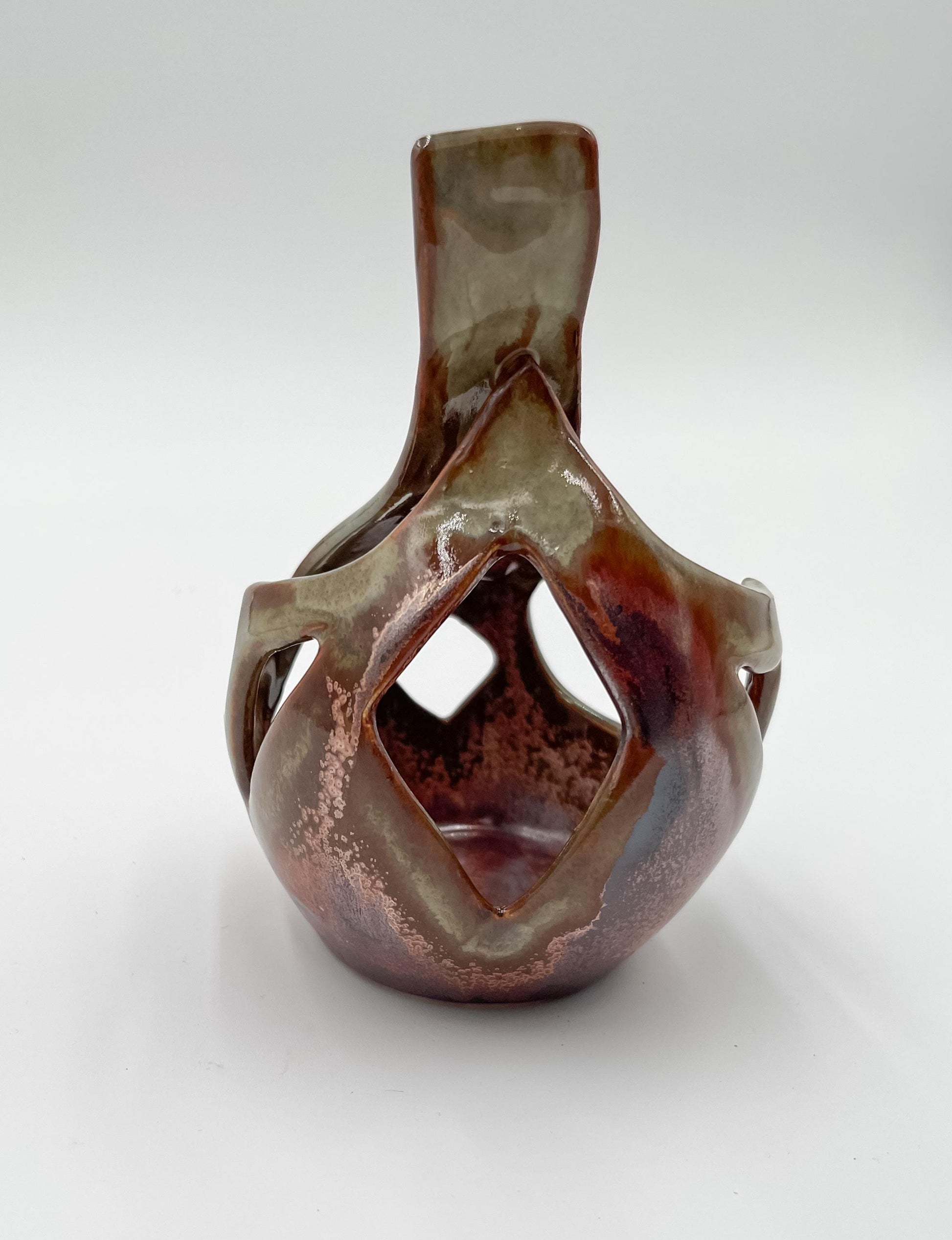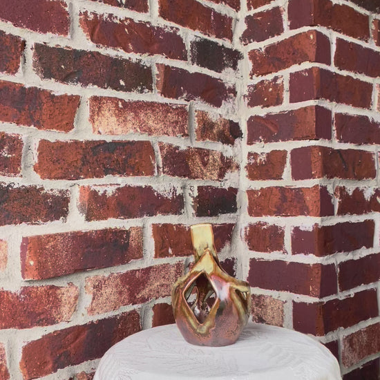 Bring a touch of warmth and contemporary design to your space with this one-of-a-kind, hand-built porcelain sculpture. Measuring 5” x 5” wide and 6” tall, this piece showcases rich brown, orange, and bronze tones that shift beautifully in the light.