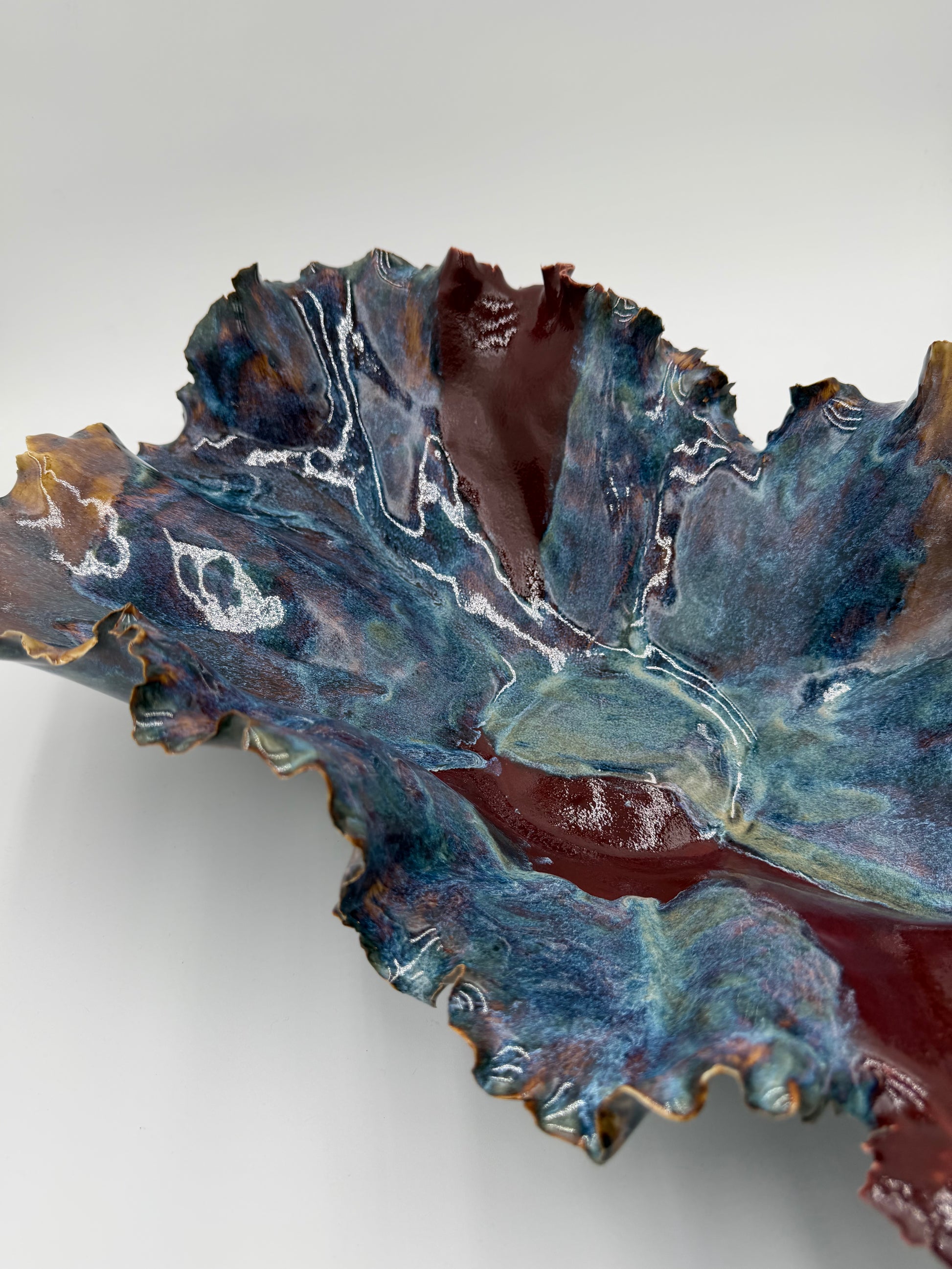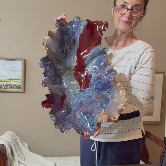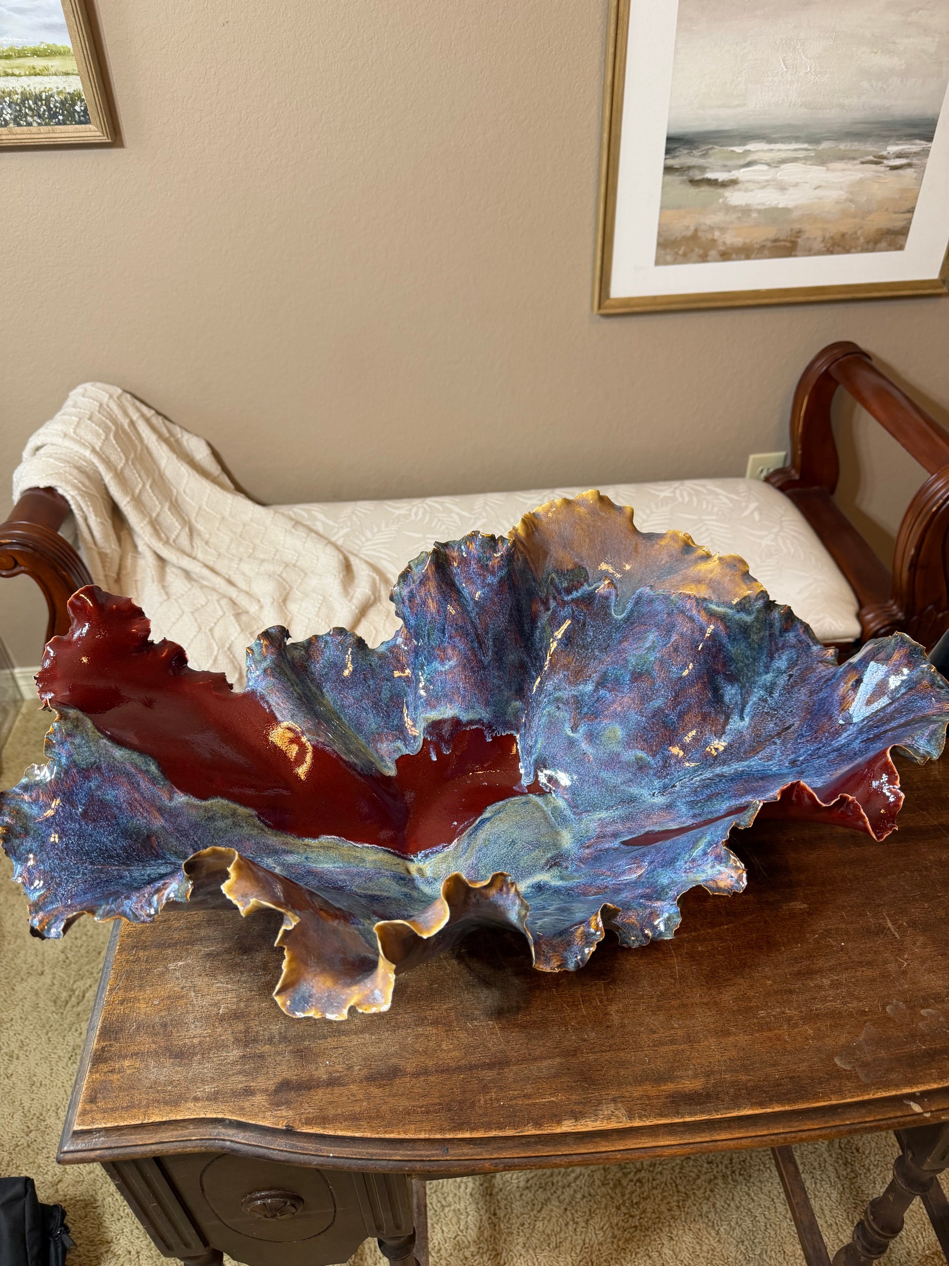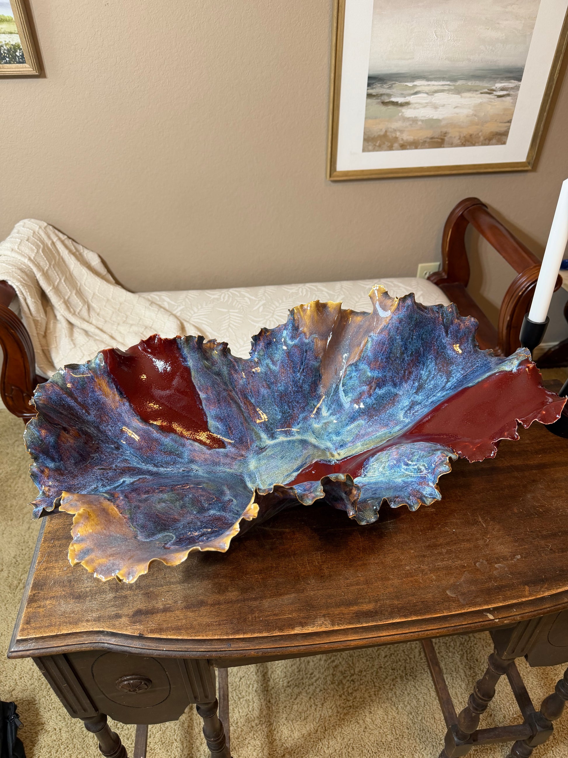 Use it as a table centerpiece, a decorative fruit or entry dish, or a keepsake display on a bookshelf or console. Its flowing lines and oceanic glazes bring a sense of calm, movement, and warmth to any space.