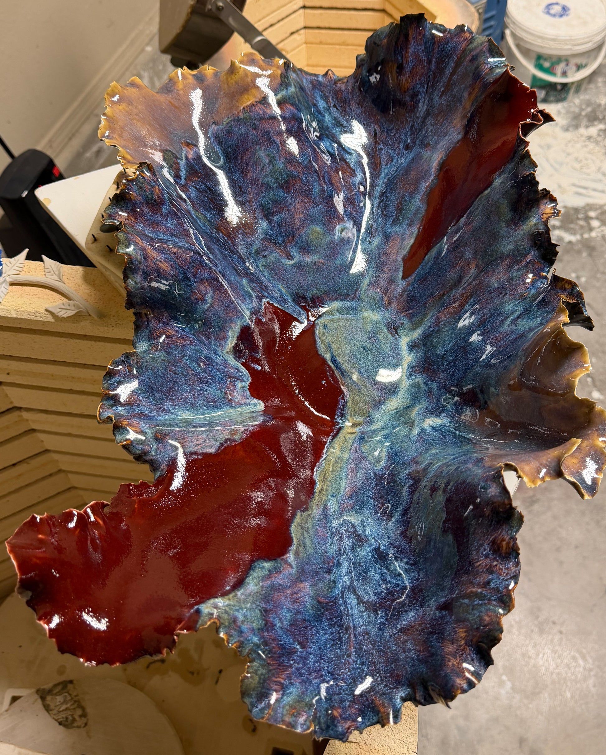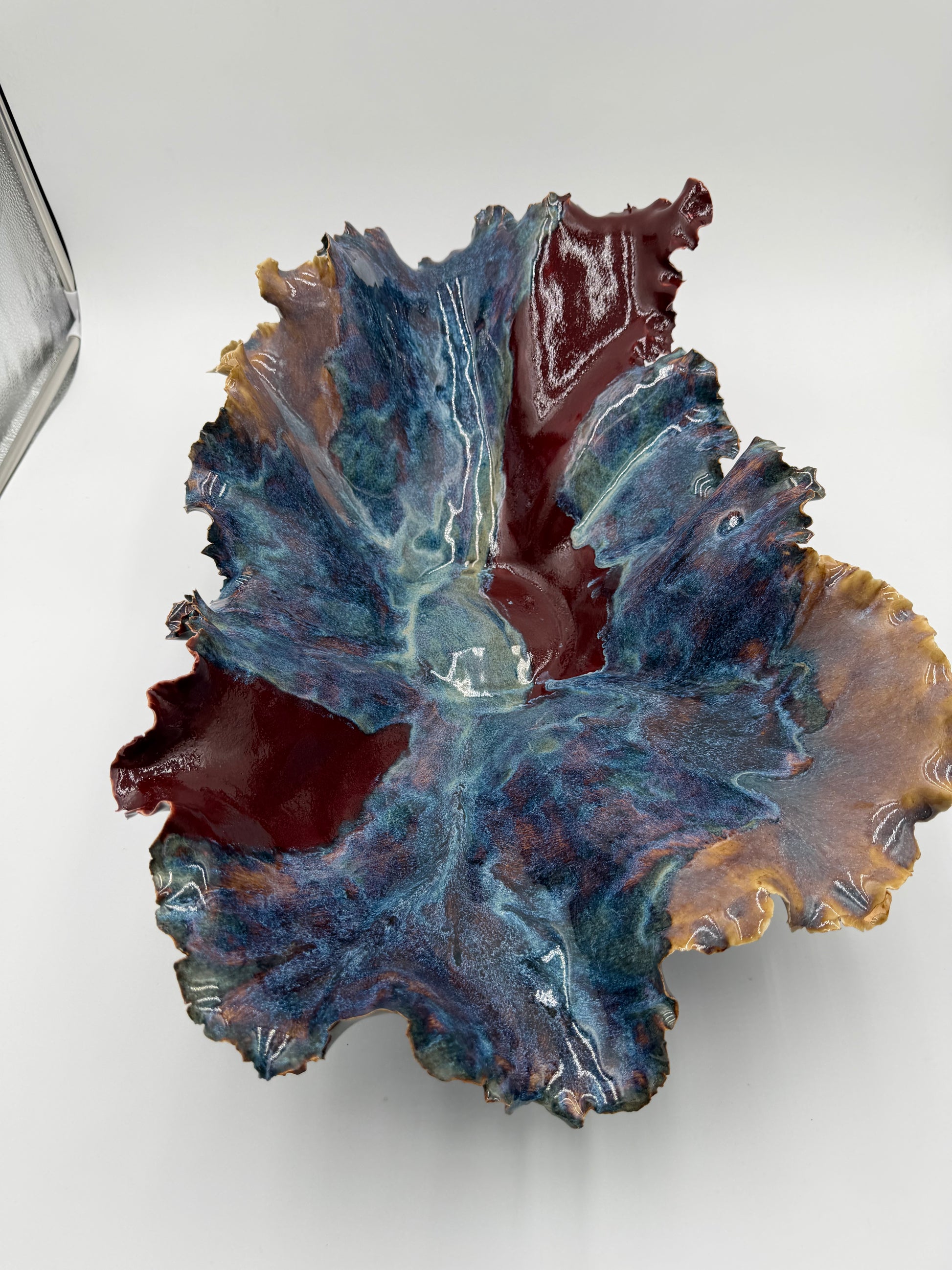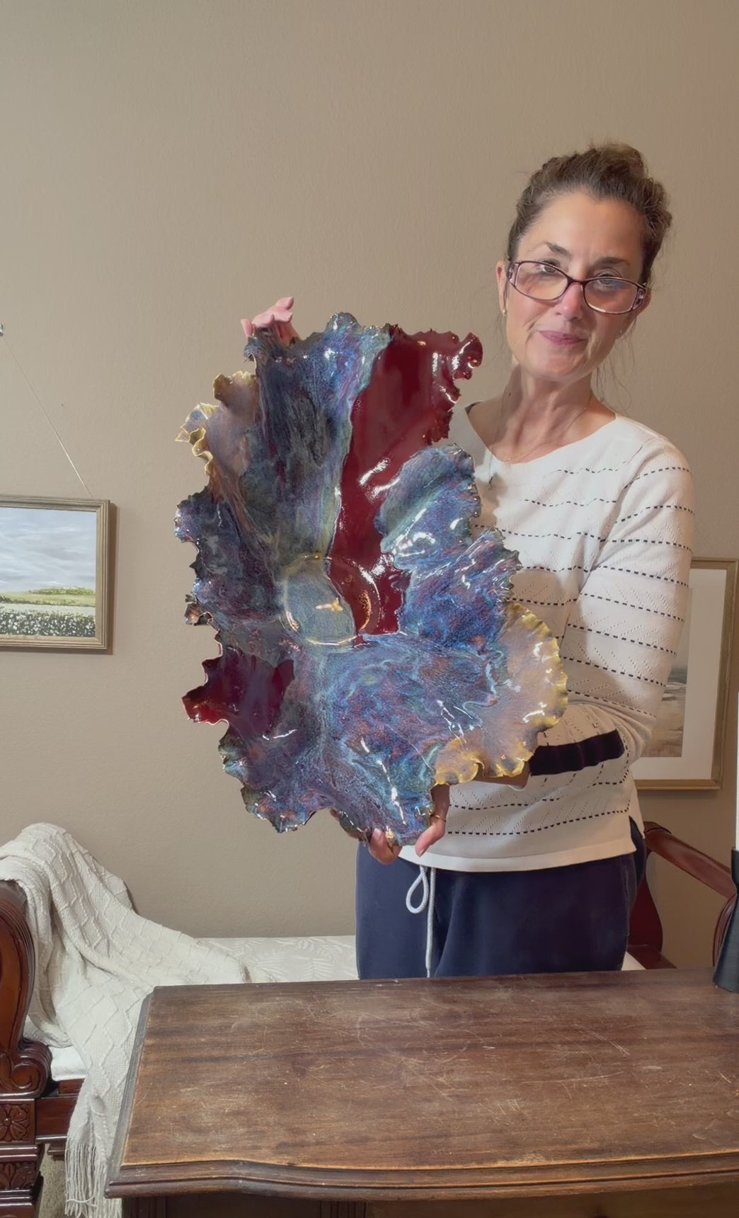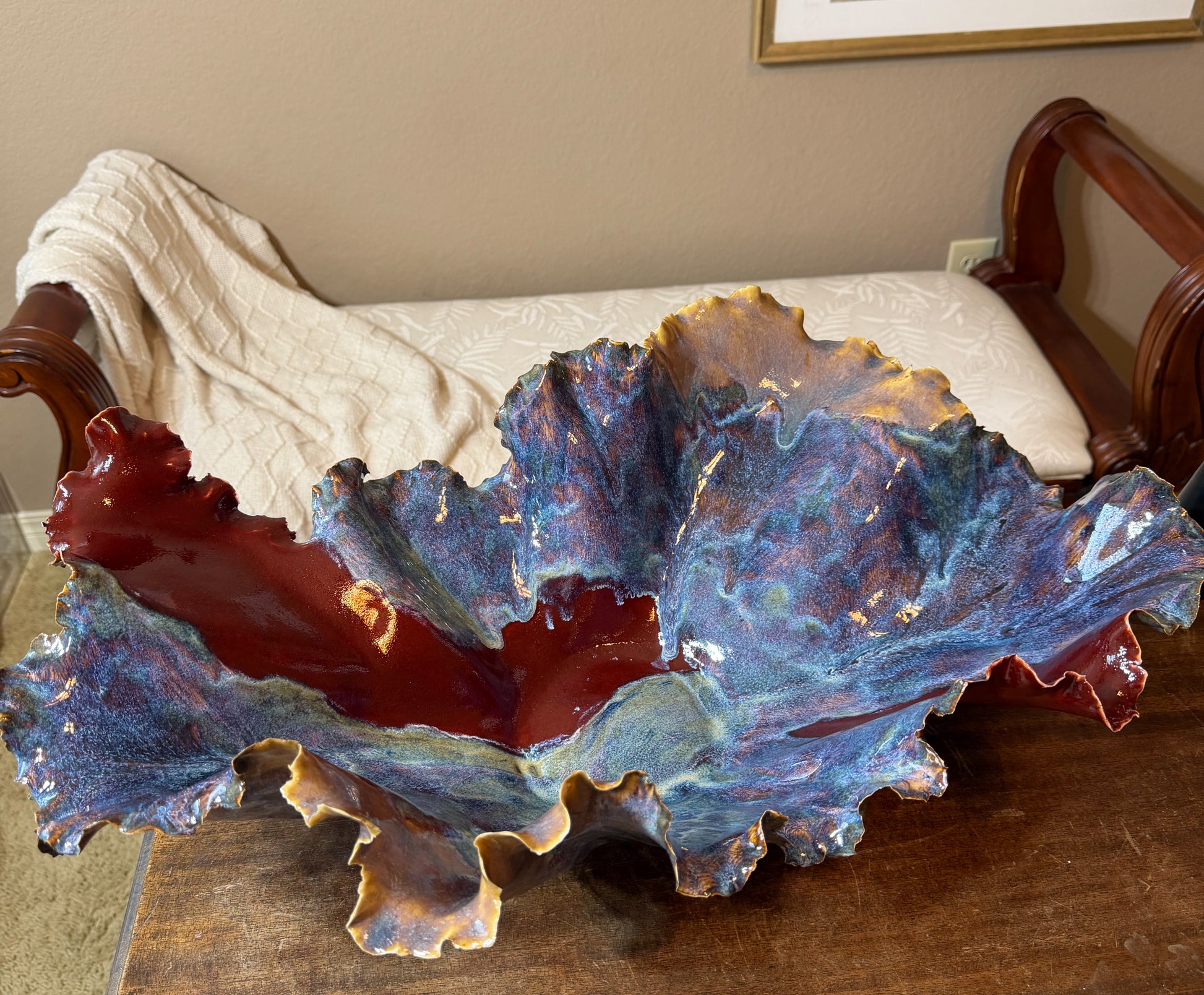 Use it as a table centerpiece, a decorative fruit or entry dish, or a keepsake display on a bookshelf or console. Its flowing lines and oceanic glazes bring a sense of calm, movement, and warmth to any space.