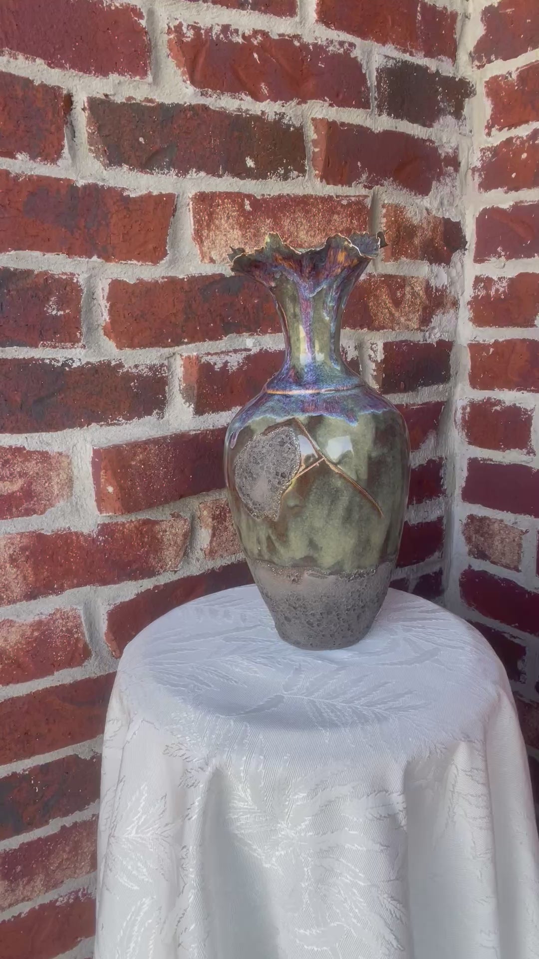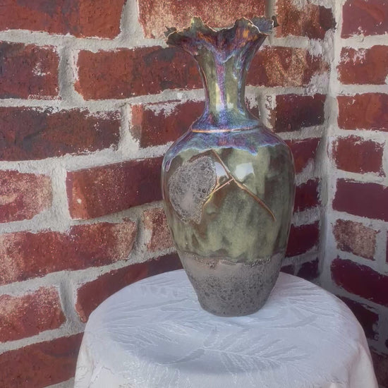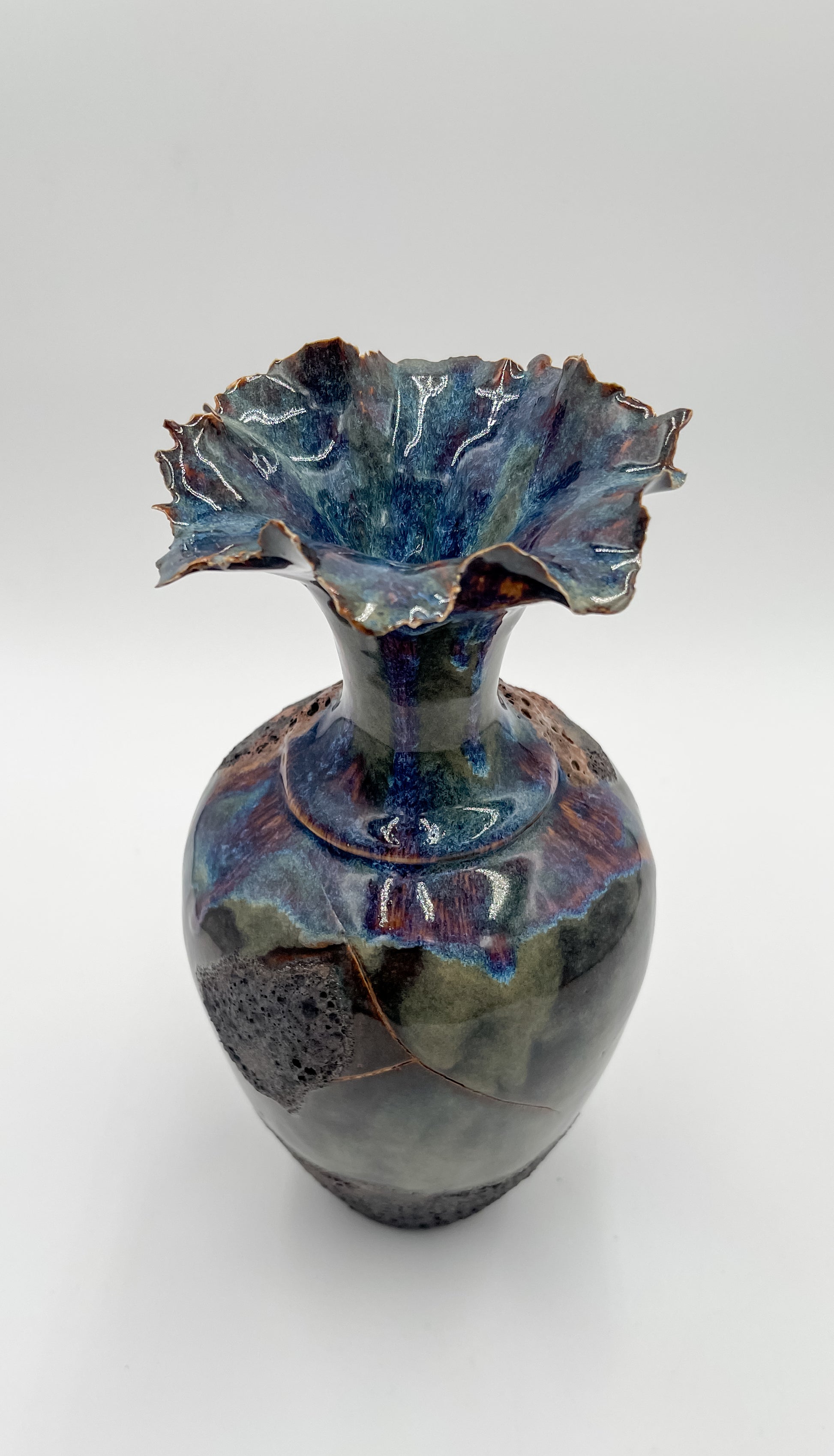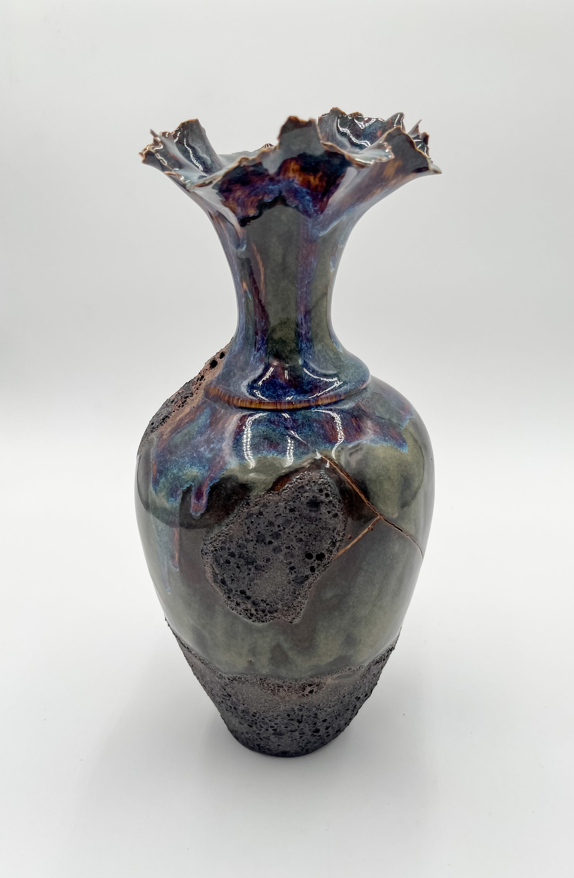 Layered glazes in natural stone tones of soft blue, mossy green and earthy browns give the vessel a river rock finish that feels organic and enduring. The contoured porcelain clay creates an elegant silhouette, while the textured glaze invites touch and adds depth.